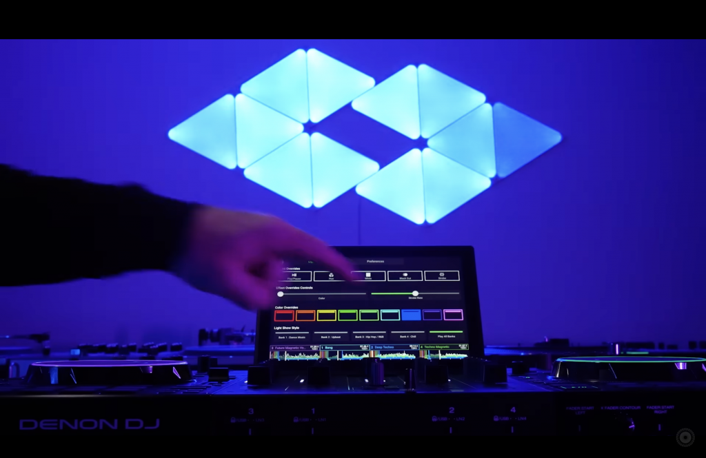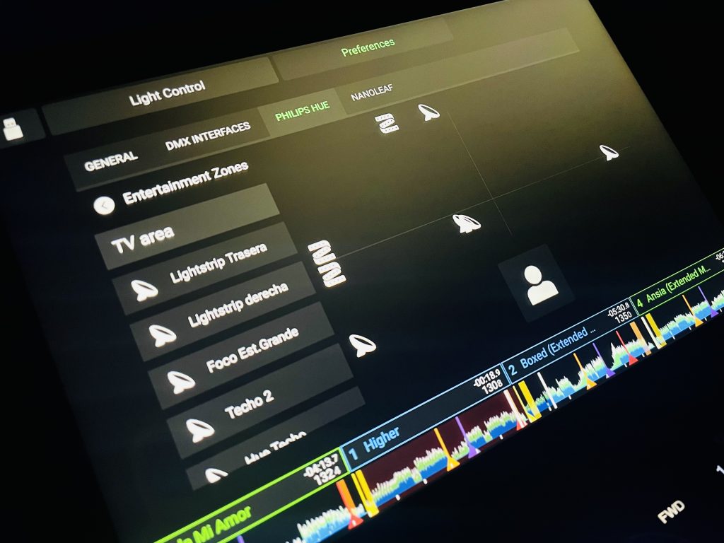 La tercera novedad es algo que ha ido evolucionando en los dispositivos de Denon DJ desde hace tiempo: su capacidad para controlar iluminación desde el aparato. Esto, con la Prime 4+ es algo muy divertido, ya que no solamente puedes conectarte al típico sistema DMX, sino que empleando el Wi-Fi del aparato puedes conectarte a redes de iluminación de sistemas domésticos como Philips Hue o Nanoleaf, y esto es sencillamente divertidísimo. Personalmente, yo tenía ventaja para probar esto, porque tengo casi toda mi vivienda con iluminación inteligente de Philips, tanto normal como decorativa, y con control RGB (¡por supuesto!) del color, y no podría ser más fácil controlarla. Por explicarlo claro: yo no tengo ni idea de iluminación para espectáculos, y en un momento tenía las luces de la casa sincronizadas con la Prime 4+, y de forma bastante intuitiva descubres como ajustar los cambios de color, el tipo de efecto que quieres que haga la luz, puedes disparar determinadas combinaciones… Está francamente bien diseñado y pensado para que, incluso si no te apetece hacer un control exhaustivo de la iluminación, puedas activarlo y dejarlo en piloto automático sin prestarle demasiado esfuerzo.