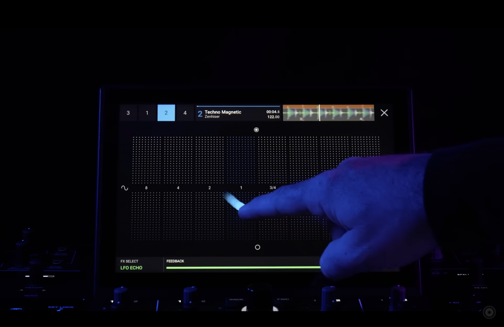 La segunda novedad “a lo grande” son los Touch FX: cada deck dispone ahora de un nuevo efecto de inserción a seleccionar entre 10 posibles, que se controla desde la pantalla táctil. Además, contamos también con 10 efectos más, controlables de la misma forma para el master. No son la repera, pero son prácticos, están bien diseñados y, en general, no suenan rancios, aunque lo mejor es que le dan un nuevo uso a la pantalla táctil. Además, la interfaz táctil para los efectos ocupa toda la pantalla y para algunos efectos tiene divisiones fáciles de entender, con lo que es difícil tocar en la parte equivocada de la pantalla.